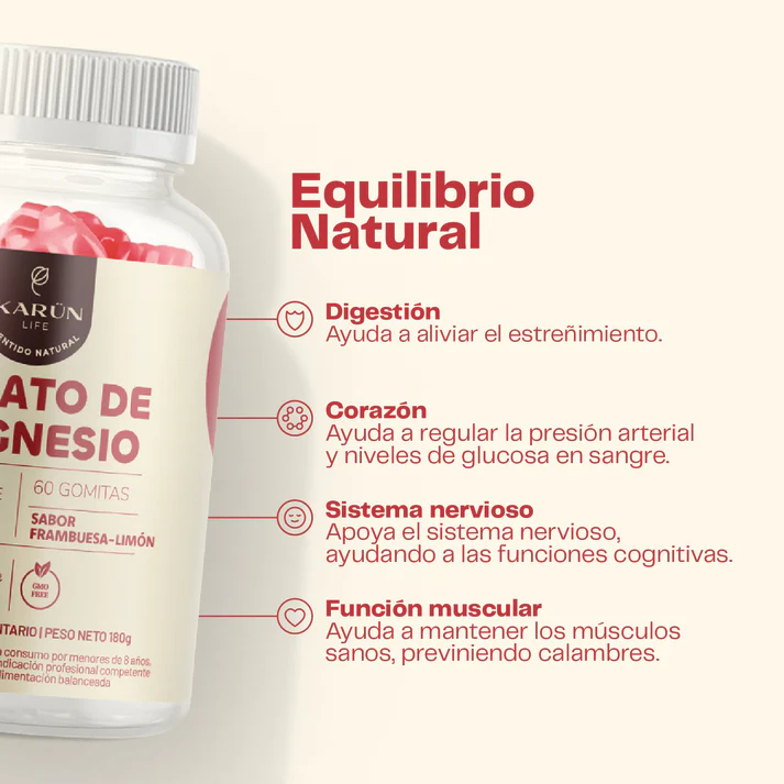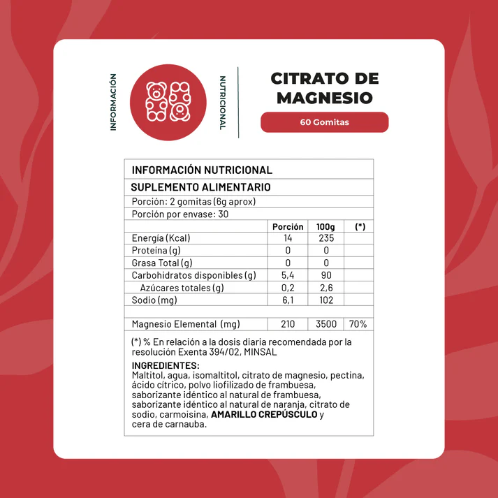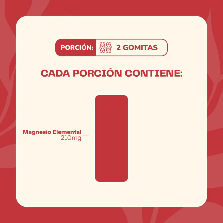 Aporta 210 mg de magnesio elemental por porción (2 gomitas)