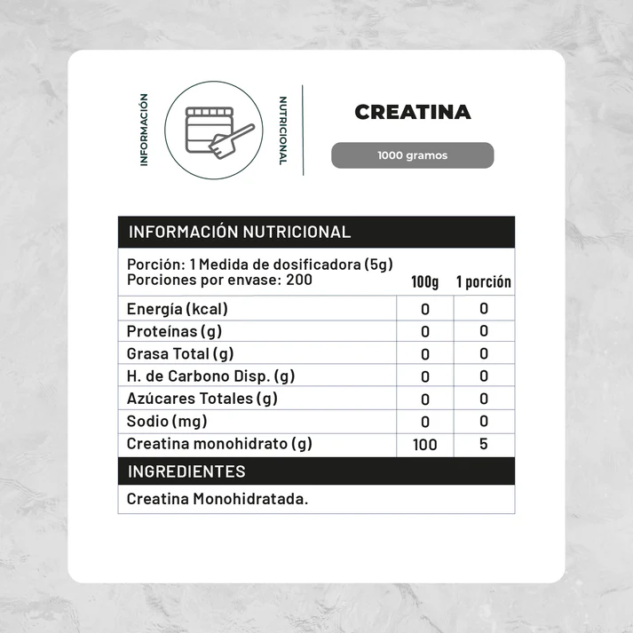 1 envase de Creatina Monohidratada (Creatine) – 1000 g (60 porciones de 5 g)