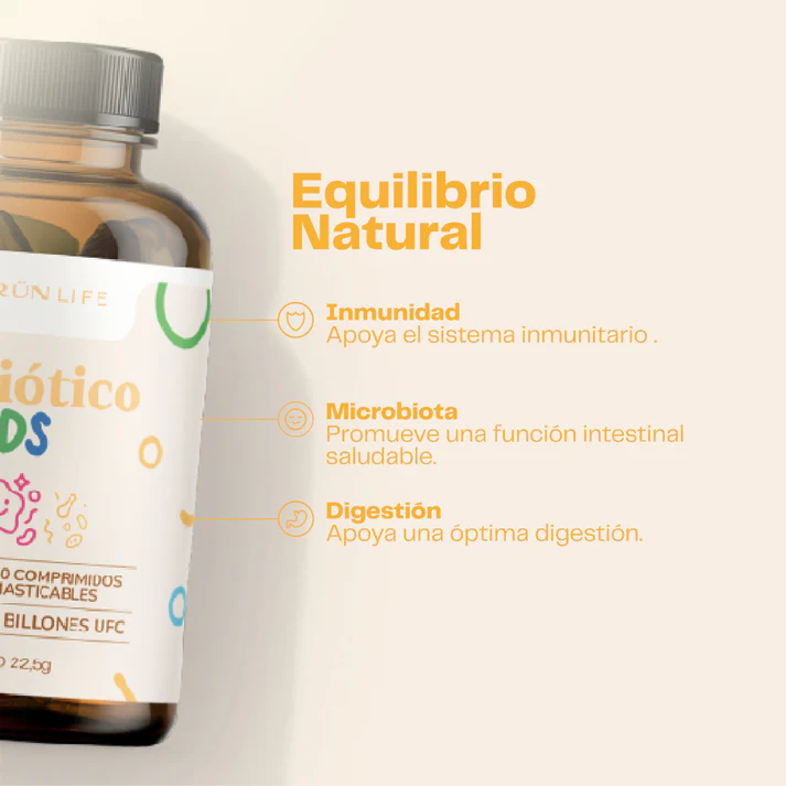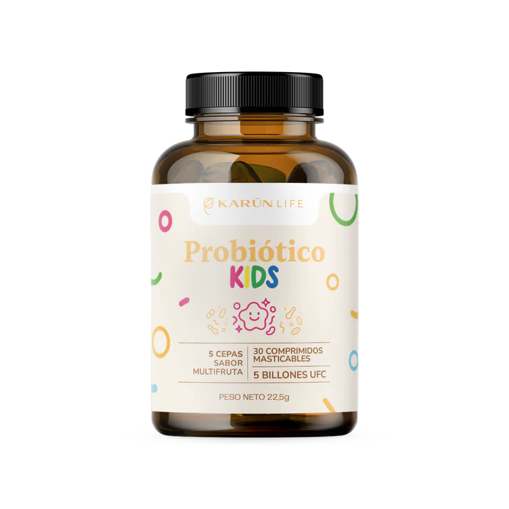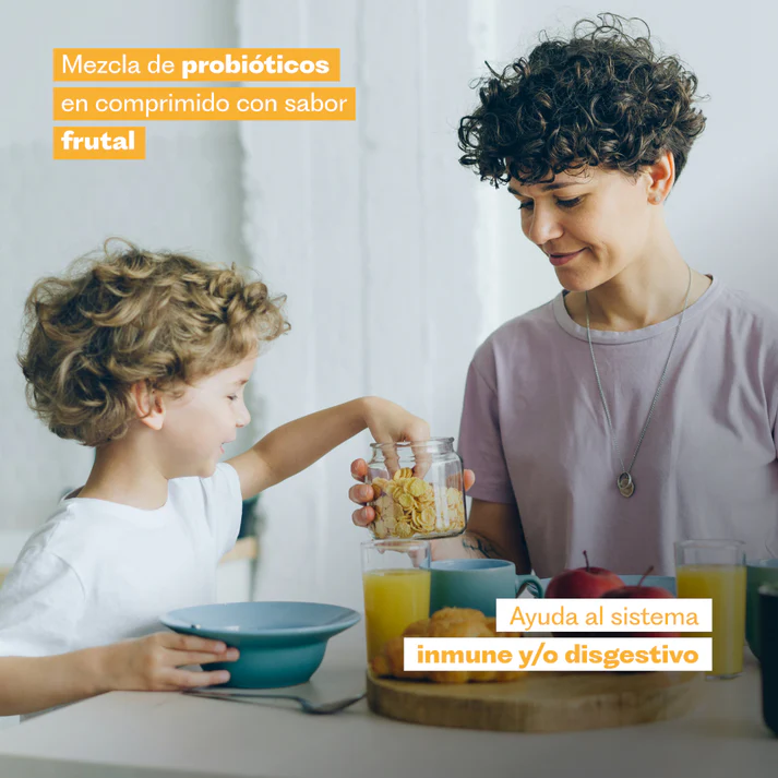 Probiótico Kids está formulado especialmente para apoyar la salud digestiva y el equilibrio de la microbiota intestinal en niños. Su formato de comprimidos masticables facilita el consumo diario, aportando cepas probióticas seleccionadas que favorecen el bienestar intestinal y el sistema inmune.
