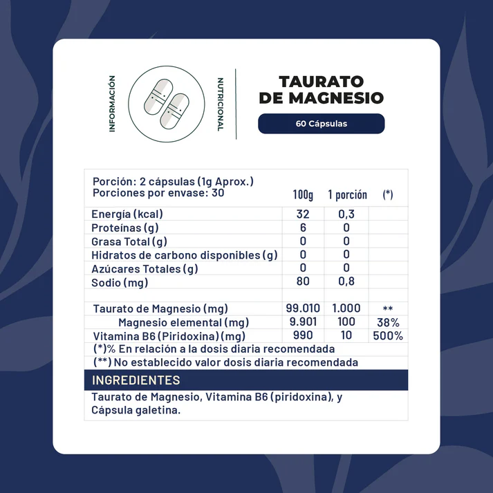 El Taurato de Magnesio es una forma especializada de magnesio diseñada para brindar apoyo integral al corazón, al cerebro y al sistema nervioso. Esta fórmula única combina los beneficios del magnesio con la taurina, un aminoácido que potencia su absorción y eficacia, promoviendo una salud cardiovascular óptima, claridad mental y estabilidad emocional.